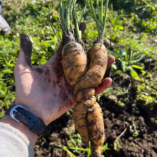 This week may include: **As always we sometimes don't know until harvest day what will be ready and of good quality, but we do our best to give you a rough idea ** Collard Greens - beautiful sweet collards. We recommend sauteing with plenty of butter. Swiss Chard - perhaps one of my favorite veggies on the farm, mostly because of the rainbow. Saute with oil and add soy sauce and sesame seeds to eat. Kale Tops - the tops of the kale plants. In order to start building our new hoop house we had to take down some plants, but we harvested the tops first. Leaf Lettuce - green and red mixed lettuce, ready to go! Brussel Sprouts - yippee! Brussel sprouts need a frost to get sweet and last week we had one. We offer them on the stalk, just break them off and roast with your favorite flavors like garlic, oil, salt and balsamic. Cabbage - green storage cabbage great for slaws or sauted. Will last many months if store in a closed plastic bag in the fridge. Peppers - last week we harvested and took down all the pepper plants. Thankfully peppers ripen and keep well off the vine so we will have peppers for a little while longer. Potatoes - purple skin and flesh, beautiful potatoes, great for roasting or baking. Beets - fresh bunches with greens. Saute the greens like you would swiss chard. Carrots - sweet fall carrots. Finally some sizable ones! Butternut Squash - beautiful butternuts, perfect for roasting and soups. We love this variety because the seed pocket is very small. Pie Pumpkins - these pumpkins are great for pies or mixing into chili. The seeds are hull-less and edible right out of the pumpkin or roasted. Don't sleep on this, they are so good. Radishes - radishes are back. Spicy and good for fresh eating or in salads. Red Onions and Shallots - we did not have a good onion year so these red onions and shallots are all we got sadly. Garlic - a staple in most meals and so versatile. You will notice the flower area is tilled up, this is where next year's garlic is going. Mixed Specialty Peppers - similar to the sweet peppers we harvested and took down all the plants but will have plenty of shishito, mad hatter, jalapeno and more. Take what you need. Available for Pick Your Own -